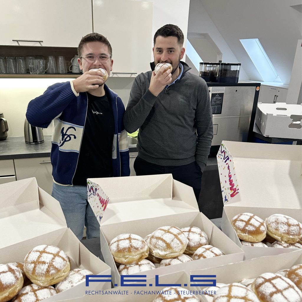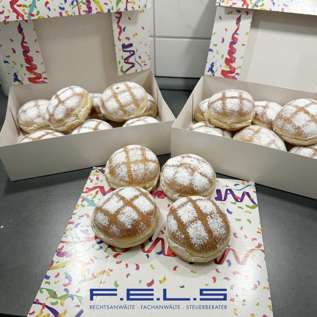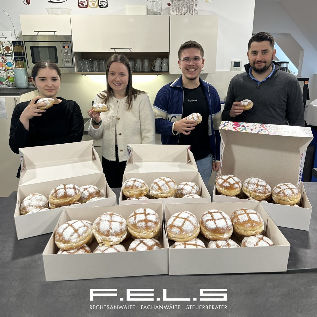 Traditionell gibt es in der Kanzlei F.E.L.S am Faschingsmontag süße Leckereien in Form von Faschingskrapfen. So wurden auch am Montag, den 16. Februar über 150 Faschingskrapfen an den verschiedenen Standorten in Bayreuth und Weiden an die Mitarbeitenden verteilt – wie man sieht mit positivem Anklang.